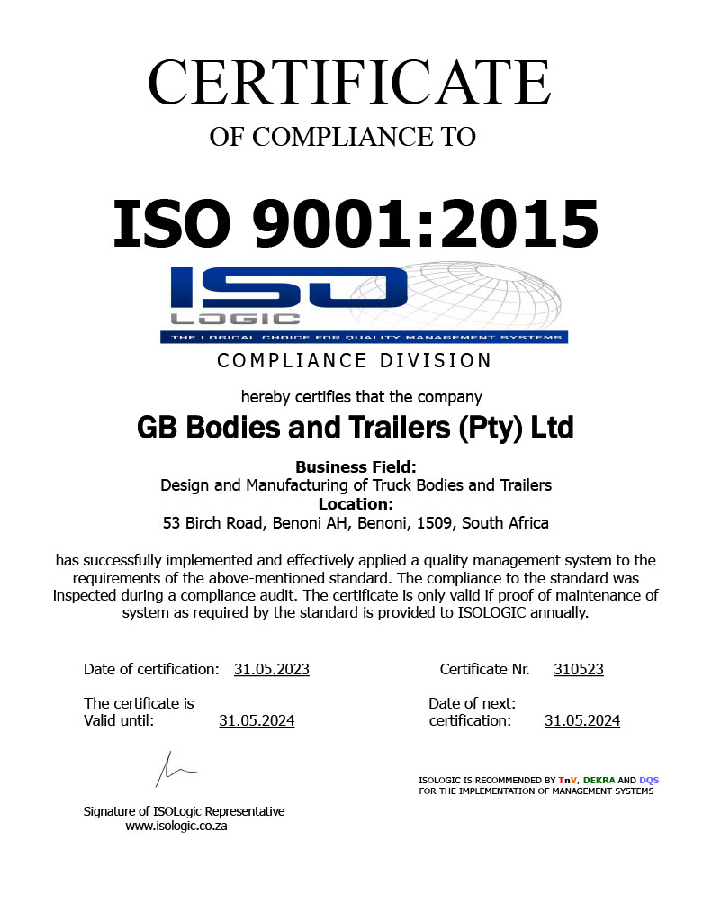 At GB Bodies and Trailers, we take immense pride in crafting top-notch truck bodies that set industry standards. Our reputation speaks volumes, backed by our unwavering commitment to excellence and our adherence to ISO 9001:2015 standards.